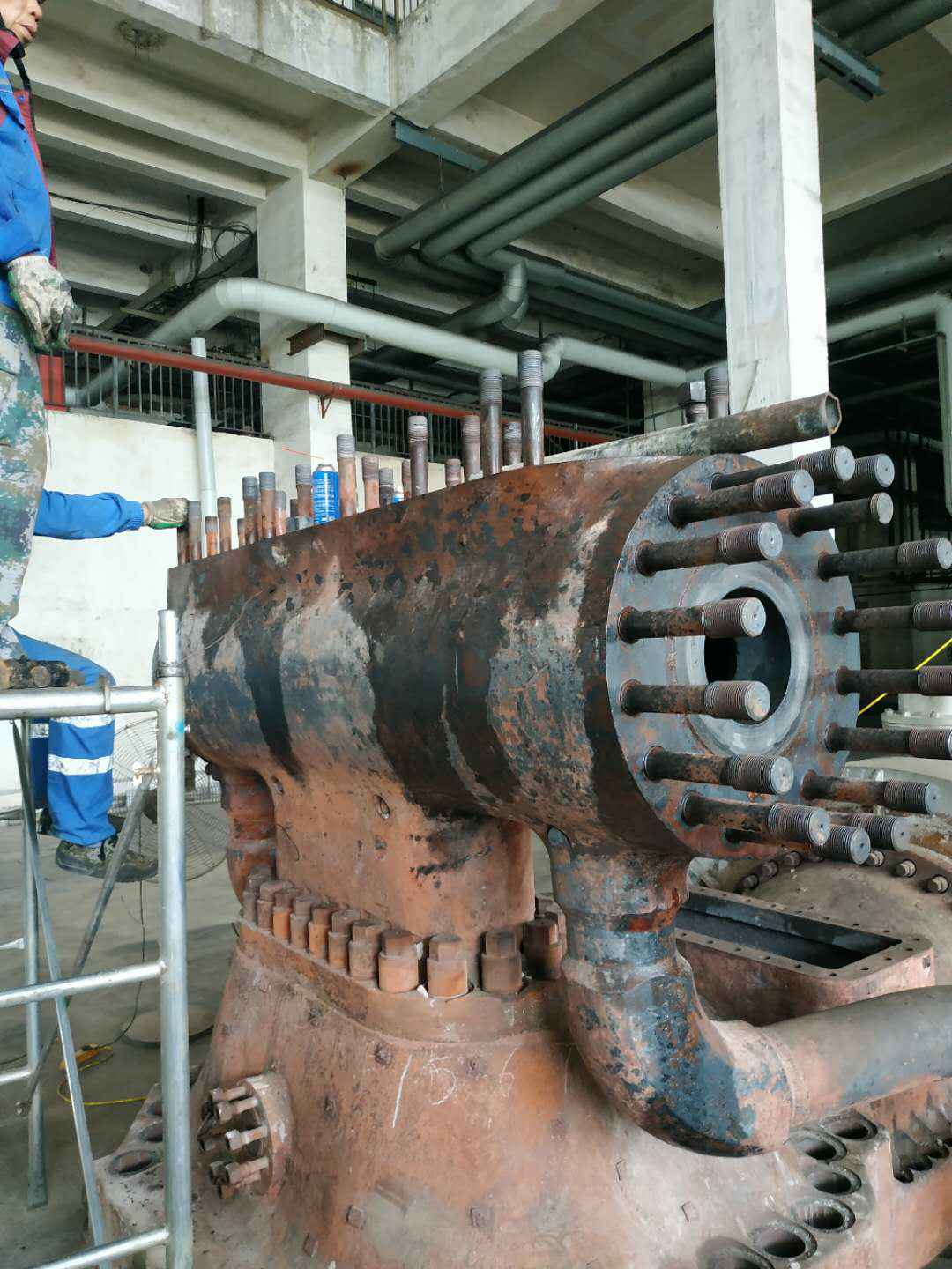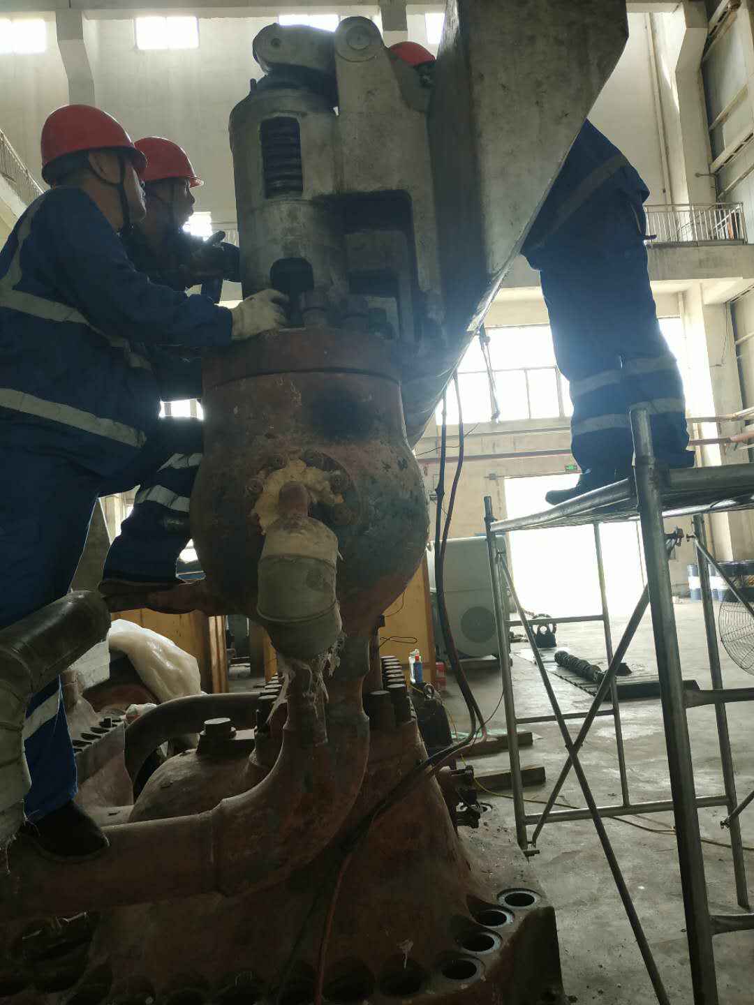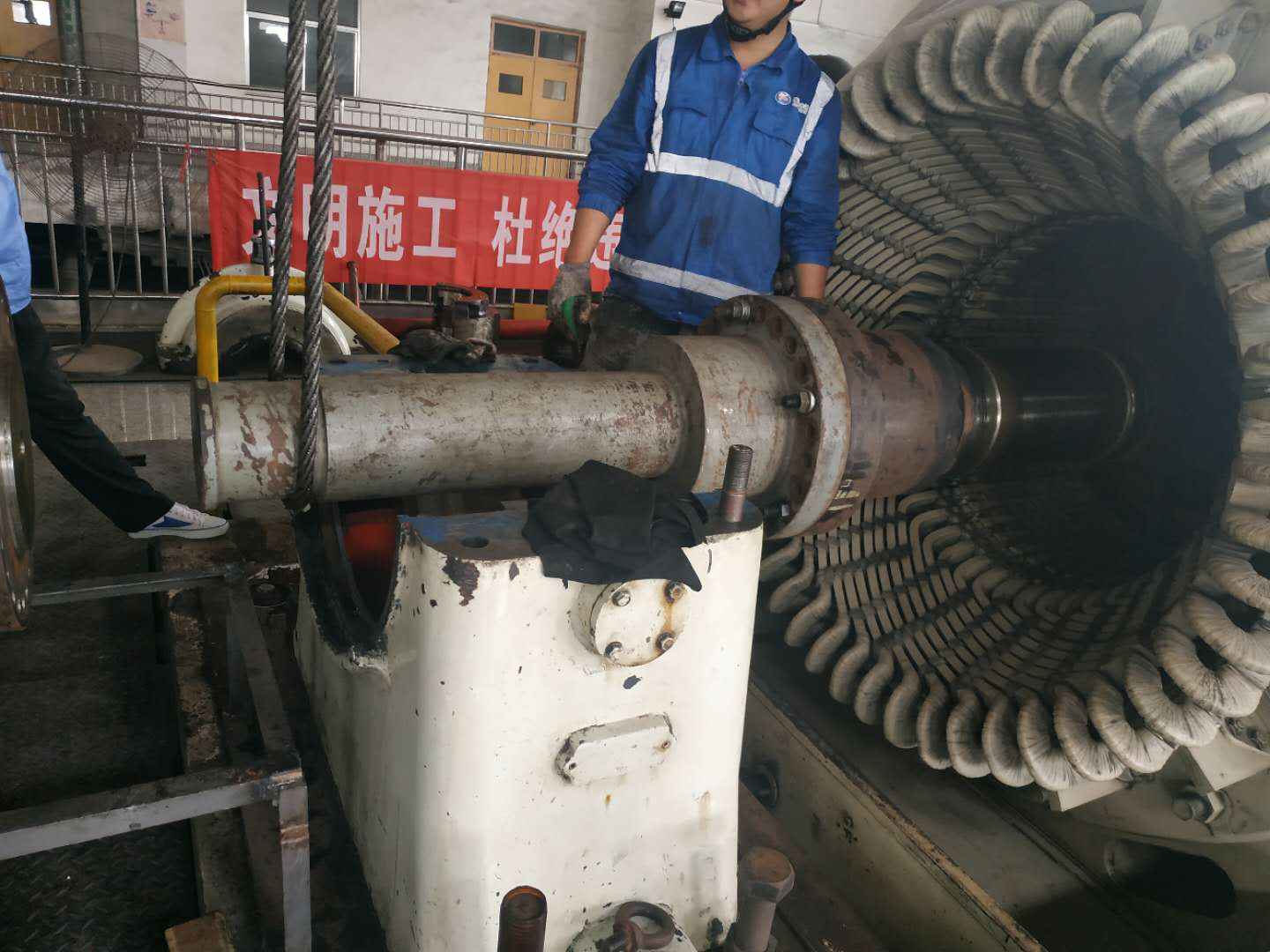 由乐竞在线官方网站-乐竞(中国)承建的山东海能化学有限责任公司机组B15MW背压式汽轮机组(原 C25抽汽凝汽式机组)大修工程现已完成凝结水泵、油站检修工作,发电机前后轴承座基础垫铁研磨工作,目前蒸汽室螺栓的拆卸工作及发电机定子与转子的清理工作陆续启动,下气缸吊隔板工作也在稳步进行中。